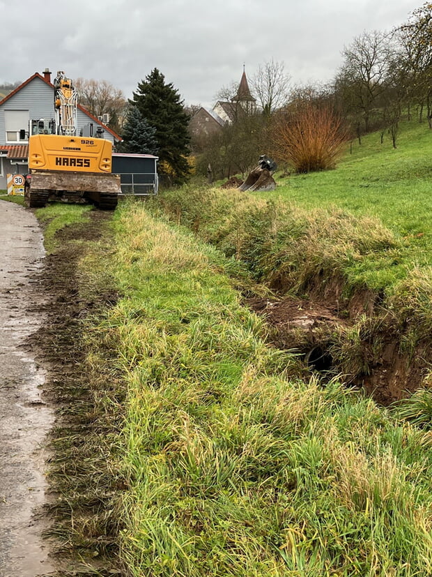 Seit dieser Woche haben nun auch die Erneuerungsarbeiten am Entwässerungsgraben entlang der Rotenbergstraße in Weiler begonnen. Bei der Starkregenuntersuchung wurde diese Maßnahme als vorrangig eingestuft, denn das Wasser läuft bei starkem Regen derzeit nicht mehr in den vorhandenen Graben. Deshalb muss die Böschung zum Graben hin abgetragen werden. Zudem müssen mehrere verschlammte und gebrochene Rohre in diesem Bereich ausgetauscht werden. Für diese Maßnahme zum Schutz bei Starkregen wendet die Gemeinde rund 17.000 € auf. Eine weitere geplante Maßnahme beim Rückhaltebecken am Benzbach muss aus naturschutzrechtlichen Gründen in den Spätsommer 2026 verschoben werden.