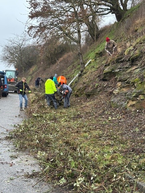 Vollen Einsatz für unsere Natur, das konnten wir am vergangenen Samstag hier in Pfaffenhofen beim Landschaftspflegetag erleben. Trotz strömenden Regens kamen rund 35 Personen, um an unseren drei Aktionen zur Landschaftspflege teilzunehmen. Eine weitere Gruppe fand sich spontan zusammen, um die Wasserabläufe bei der Michelbacher Steige freizulegen. In Gruppen aufgeteilt, ging es anschließend zum Felsband oberhalb von Weiler. Seit Jahren schneiden unsere fleißigen Helfer dort immer wieder die Felsen, von wuchernden Brombeeren und anderen Sträuchern frei. Die Natur holt sich Bereiche davon immer wieder zurück, deshalb ist diese Arbeit enorm wichtig für die dort lebenden Eidechsen und anderen Reptilien.