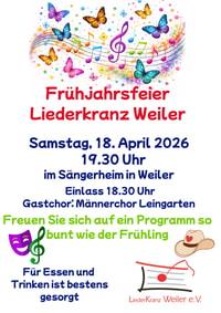 Der Liederkranz Weiler lädt herzlich zur Frühjahrsfeier am Samstag, den 18.04.2026 um 19.30 Uhr ins Sängerheim nach Weiler ein. Saalöffnung erfolgt um 18.30 Uhr. Wir freuen uns auf zahlreiche Gäste.
